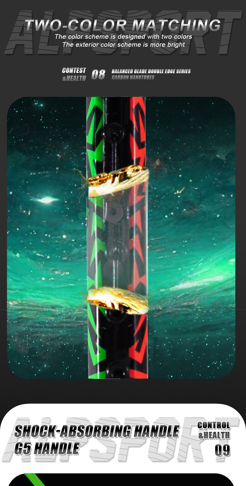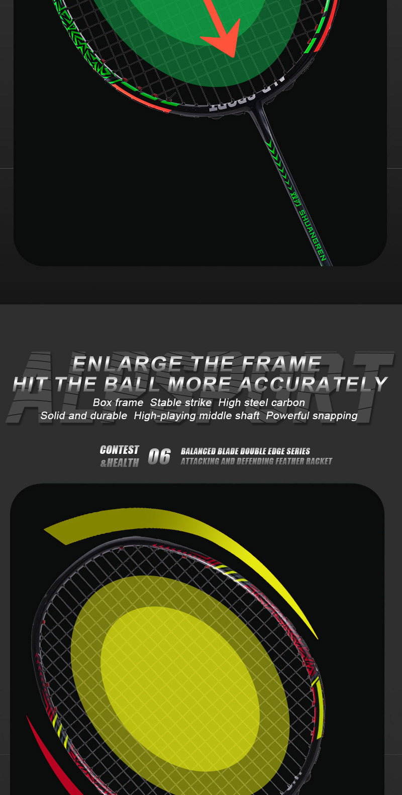 Features: Double face color and pattern / Strong Smash / High-speed attack performance / High hardness and durability / Anti-distortion / High resistance / Strong pressure resistance / Ultra-light and high-elasticity / Strong bearing capacity / Uniform frame