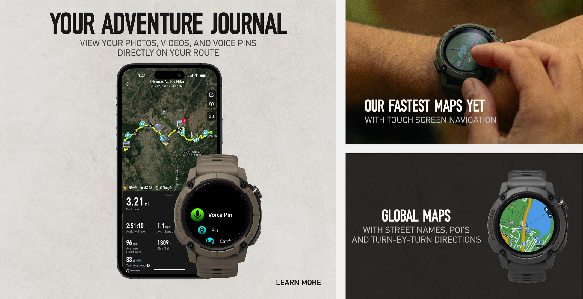 Designed for hikers, anglers, and adventurers of all types who see the outdoors as their home away from home, COROS NOMAD combines GPS navigation, a range of sport modes, safety features, and an all-new Adventure Journal tool to document every step, catch, and summit along the way.
