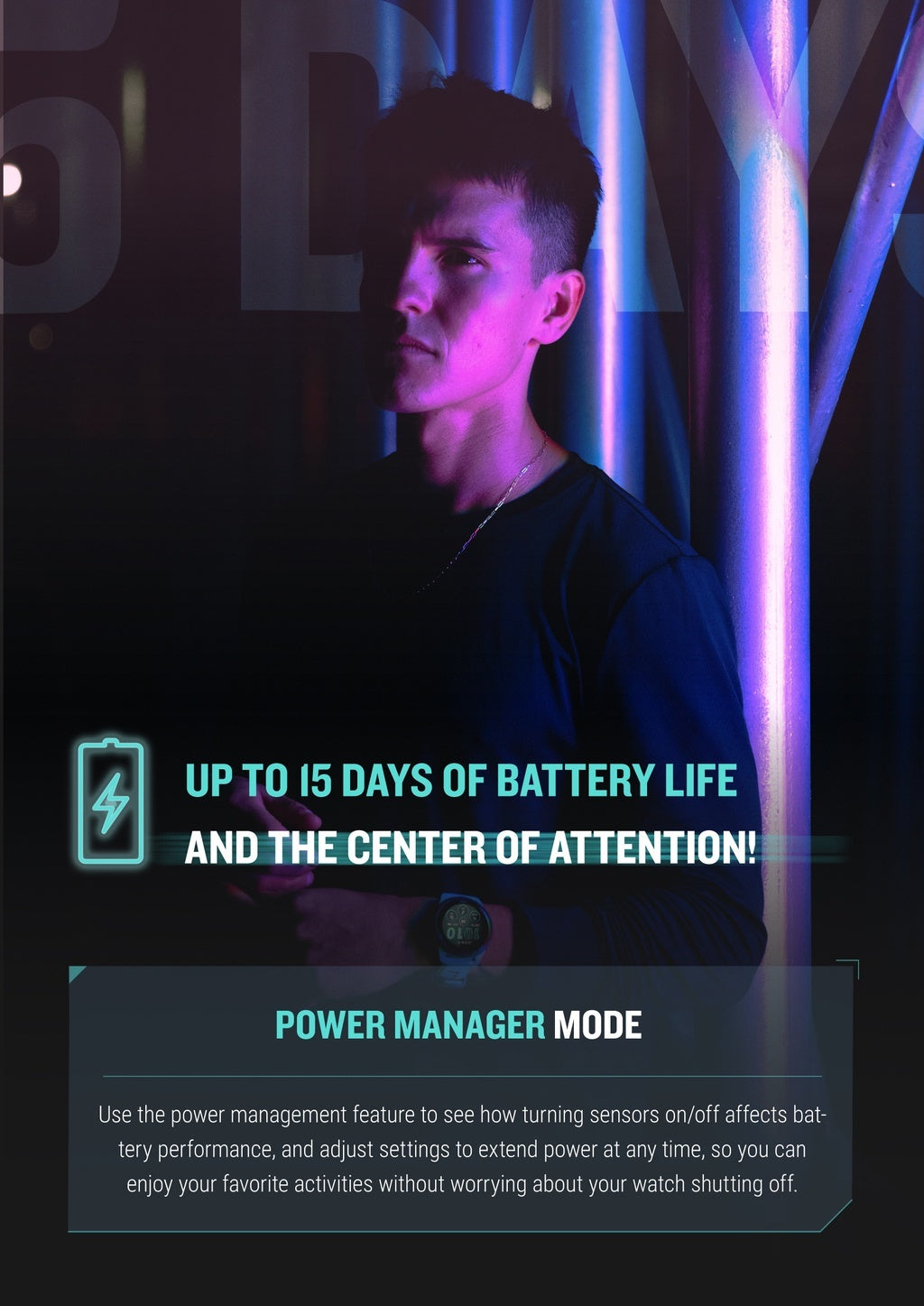 Battery Life Smartwatch mode: Up to 13 days, GPS-Only GNSS mode: Up to 20 hours, SatIQ (AutoSelect), GNSS mode: Up to 16 hours, All-Systems GNSS mode + Multi-Band: Up to 14 hours GPS-Only GNSS mode with music: Up to 7 hours SatIQ (AutoSelect) GNSS mode with music: Up to 6.5 hours All-Systems GNSS mode + Multi-Band with music: Up to 6 hours