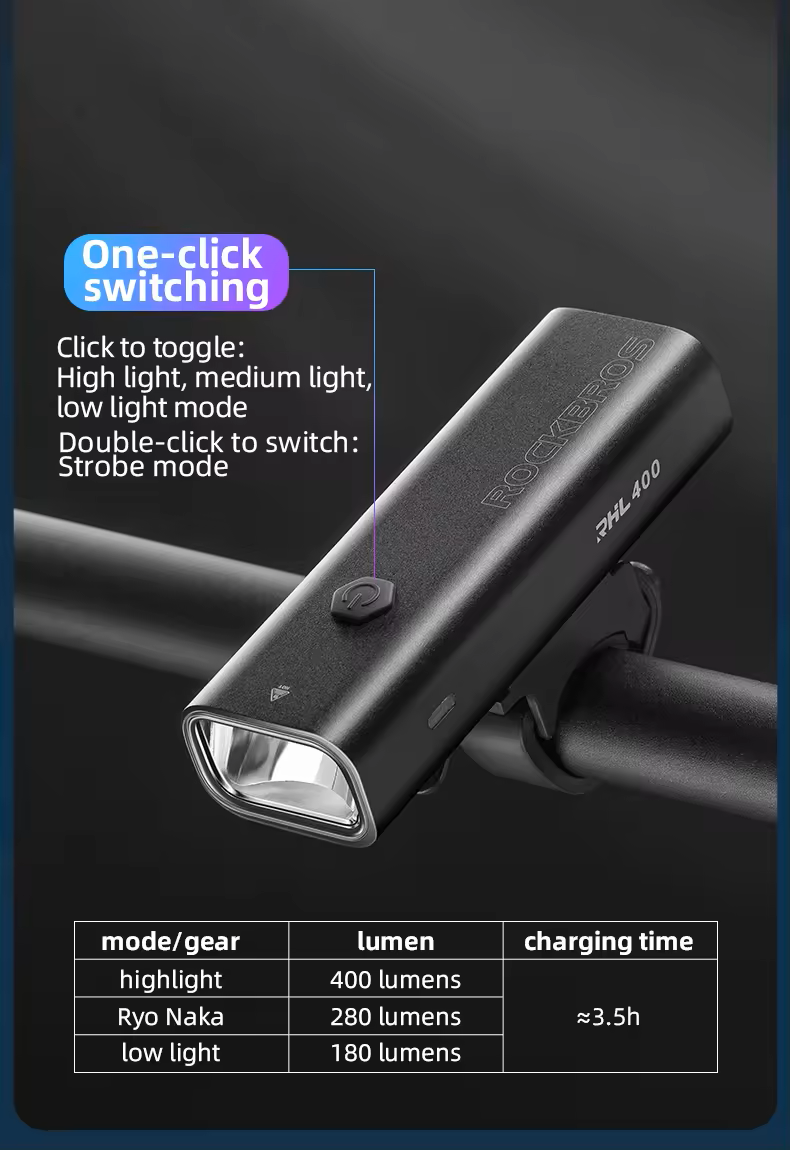 Rockbros Portable Waterproof USB Rechargeable BICYCLE FRONT LIGHT 400 Lumens