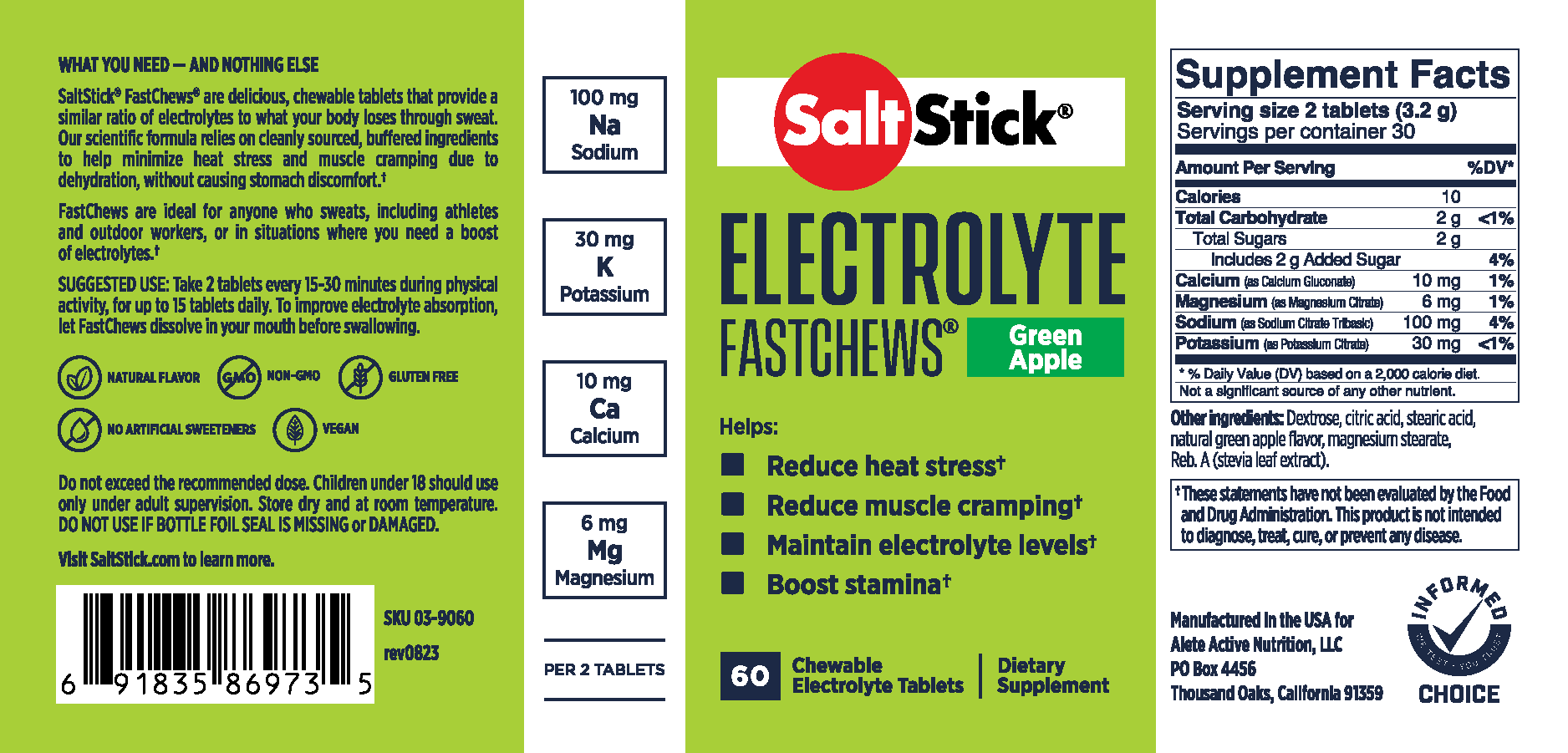 Green apple-flavored SaltStick Electrolyte FastChews are chewable tablets made to replace electrolytes lost through perspiration during long-duration exercise. They are designed to function rapidly and provide fast-acting electrolytes without the added calories, sugar, or carbohydrates typically found in sports drinks. They contain salt, potassium, calcium, and magnesium.