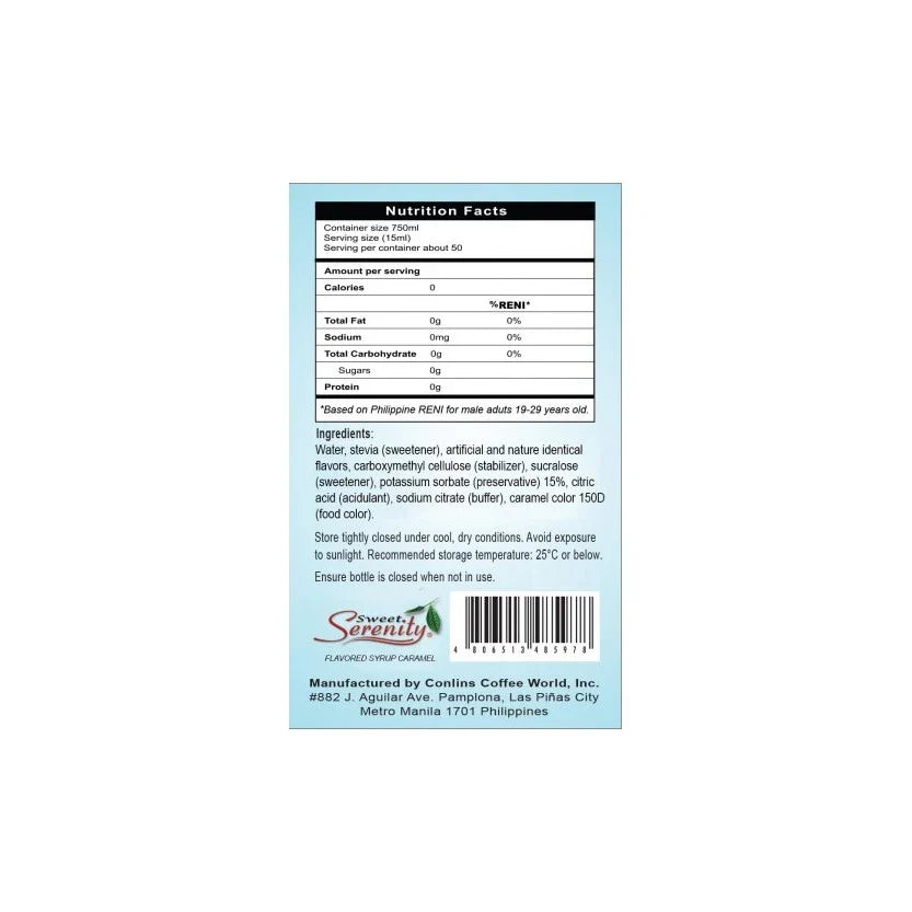 Serenity Sugar Free Caramel Syrup delivers a rich, buttery caramel flavor without added sugar, ideal for those managing their sugar intake. This 1-liter bottle provides a smooth, indulgent caramel taste perfect for enhancing coffee, desserts, and beverages. Expertly crafted to maintain authentic flavor while supporting dietary goals, it is a versatile addition to both professional and home kitchens.