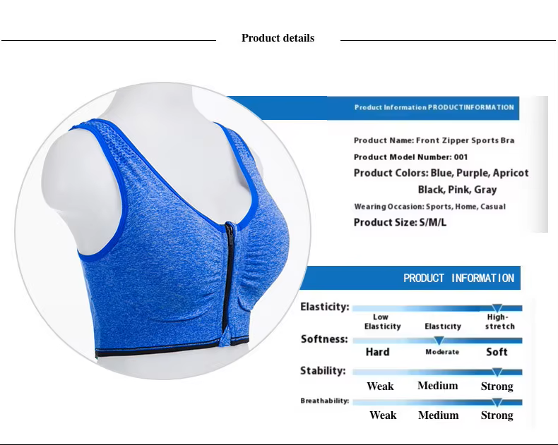 This women's sports bra features a front zipper for easy wear and removal, combining convenience with secure support. Designed without wires, it minimizes discomfort while providing effective shock-proof performance during physical activities. Crafted from breathable materials, it ensures ventilation to keep you cool and dry, making it an ideal choice for intense workouts or everyday athletic wear.